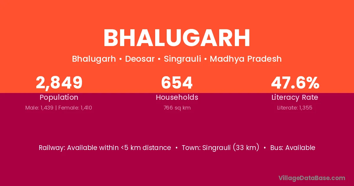 Singrauli (33 km) is the nearest town to Bhalugarh village for major economic activities and is located approximately 33 km away.