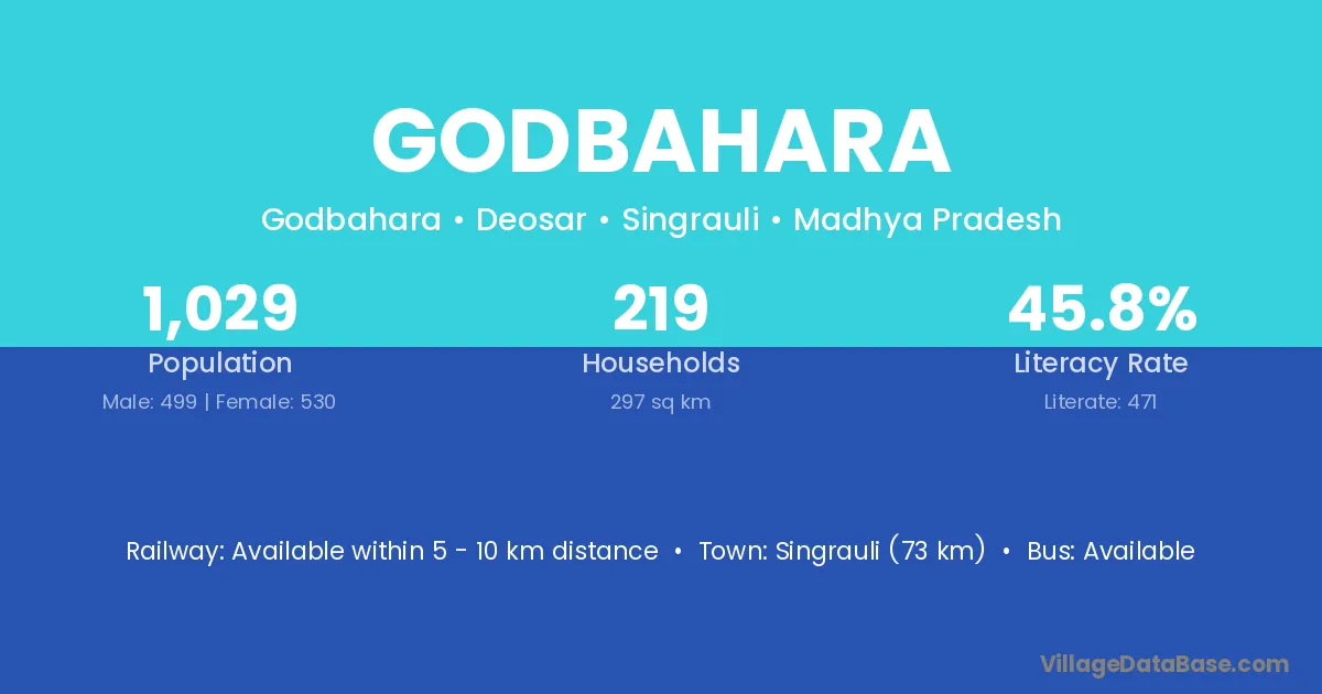 Singrauli (73 km) is the nearest town to Godbahara village for major economic activities and is located approximately 73 km away.