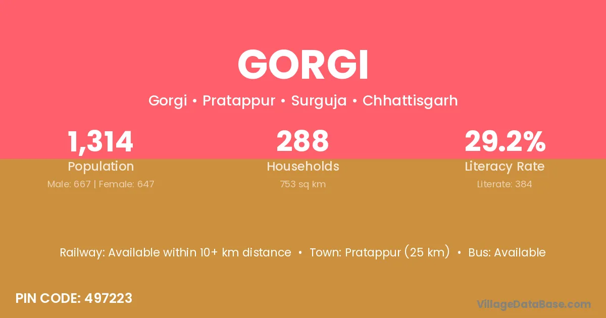 Sidhi (50 km) is the nearest town to Gorgi village for major economic activities and is located approximately 50 km away.