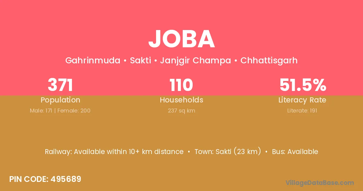 The literacy rate of Joba village is 39.30%. Male literacy stands at 46.27% and female literacy at 31.94%.