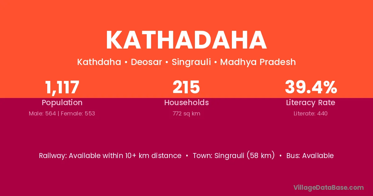 Singrauli (58 km) is the nearest town to Kathadaha village for major economic activities and is located approximately 58 km away.