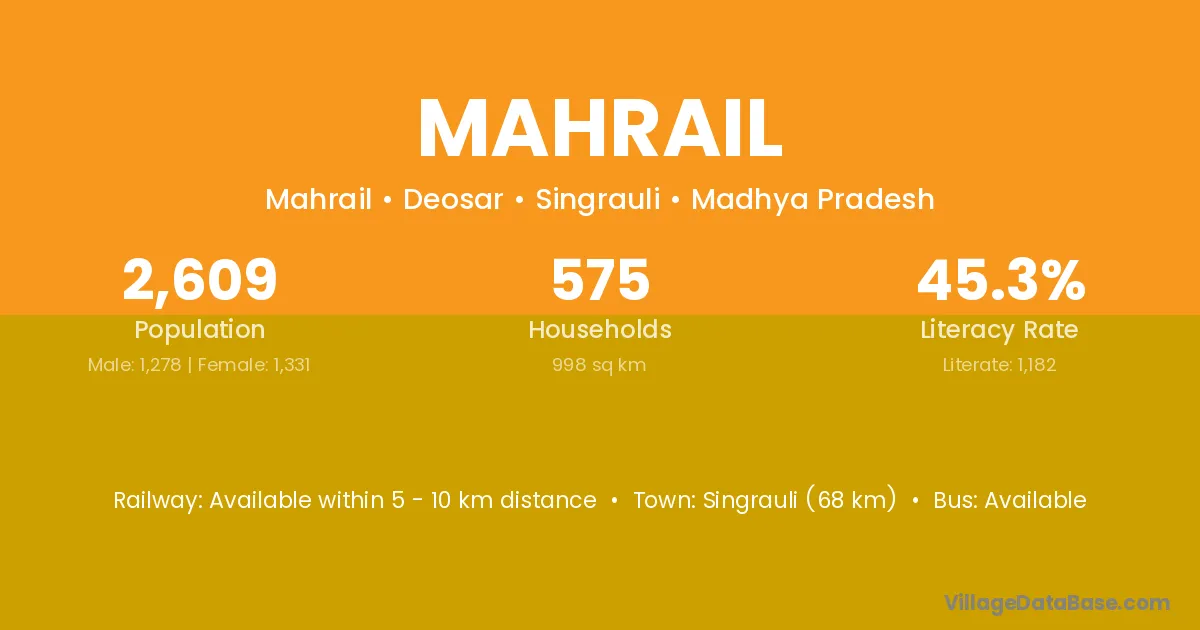Singrauli (68 km) is the nearest town to Mahrail village for major economic activities and is located approximately 68 km away.