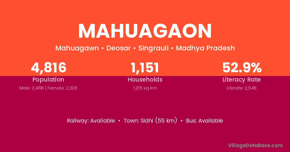 Sidhi (55 km) is the nearest town to Mahuagaon village for major economic activities and is located approximately 55 km away.