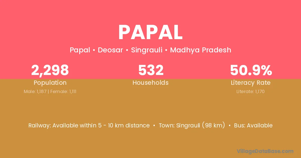 Singrauli (98 km) is the nearest town to Papal village for major economic activities and is located approximately 98 km away.