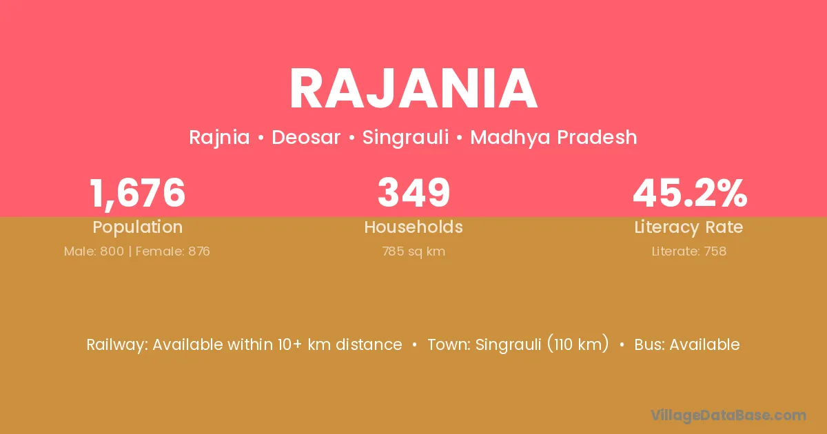 Singrauli (110 km) is the nearest town to Rajania village for major economic activities and is located approximately 110 km away.