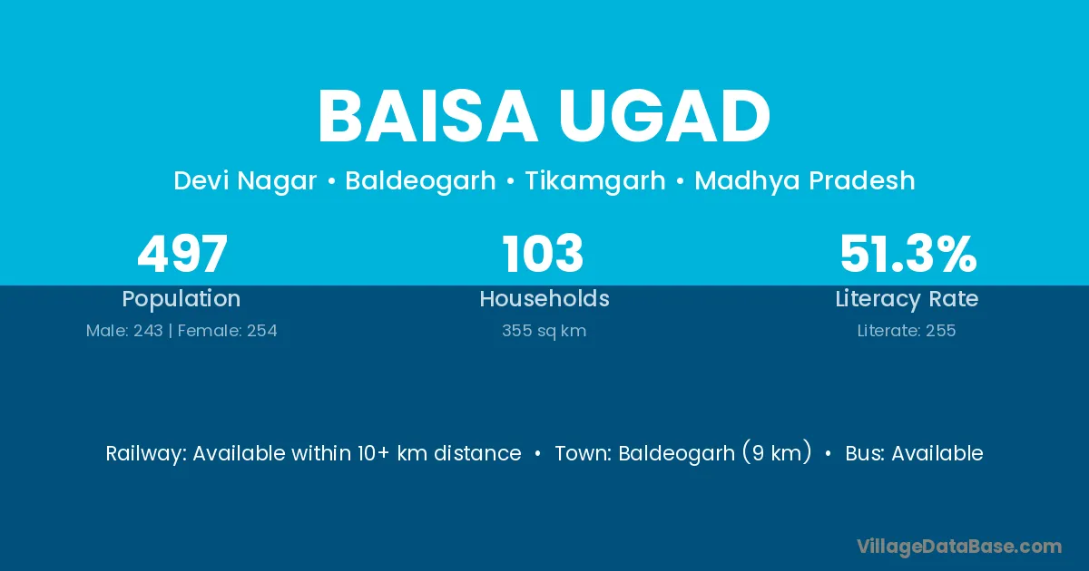 Baldeogarh (9 km) is the nearest town to Baisa Ugad village for major economic activities and is located approximately 9 km away.