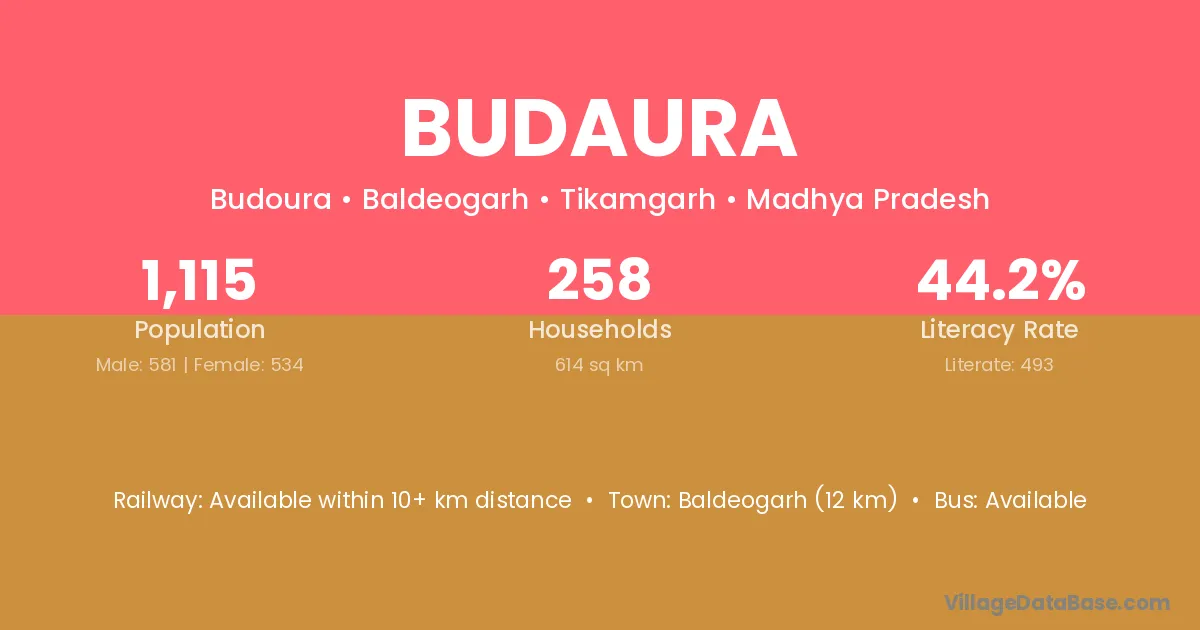 Baldeogarh (12 km) is the nearest town to Budaura village for major economic activities and is located approximately 12 km away.