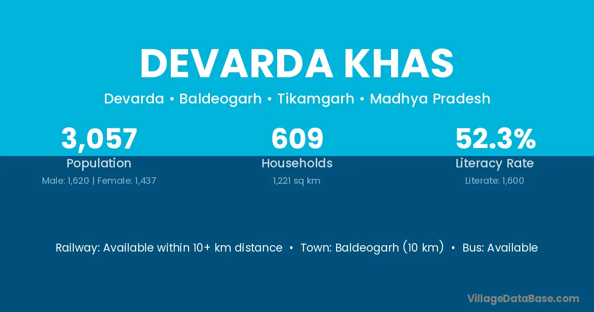 Devarda Khas village has a total population of 3,057 people, of which 1,620 are males and 1,437 are females.