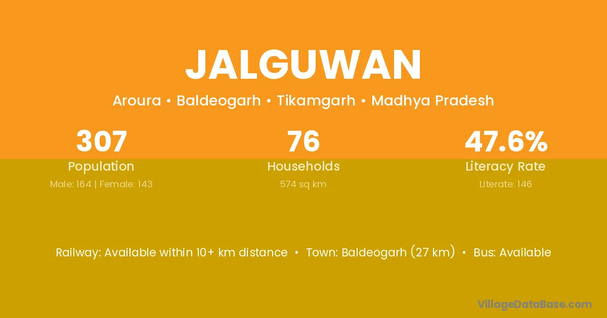 Baldeogarh (27 km) is the nearest town to Jalguwan village for major economic activities and is located approximately 27 km away.