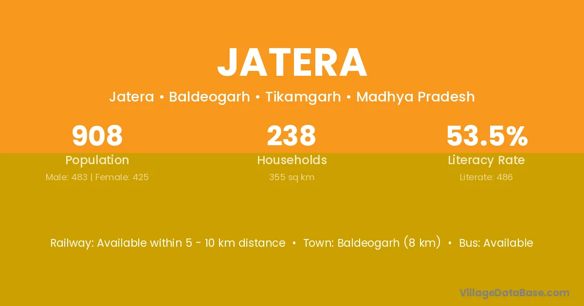 Baldeogarh (8 km) is the nearest town to Jatera village for major economic activities and is located approximately 8 km away.