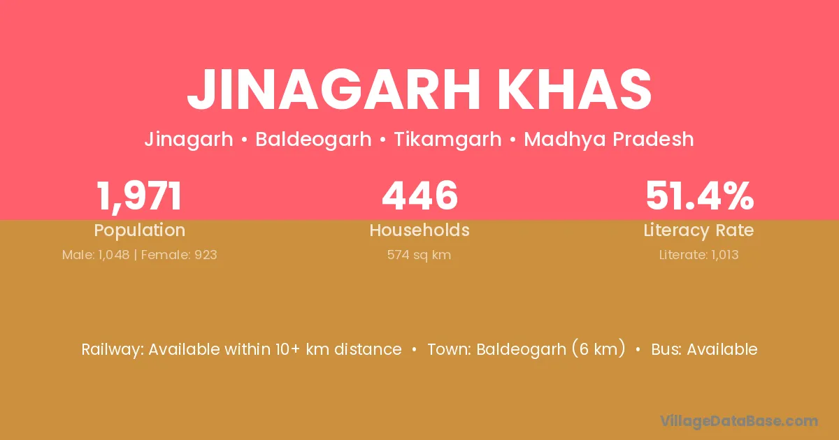 Baldeogarh (6 km) is the nearest town to Jinagarh Khas village for major economic activities and is located approximately 6 km away.