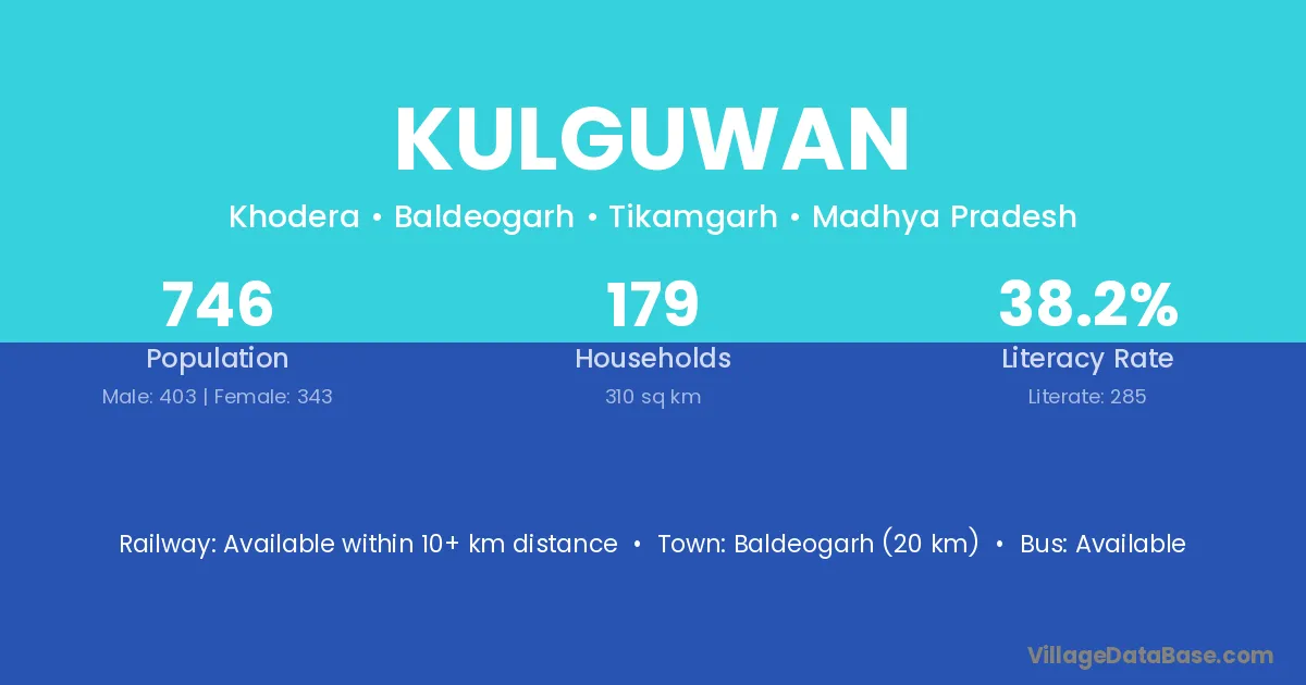 Baldeogarh (20 km) is the nearest town to Kulguwan village for major economic activities and is located approximately 20 km away.