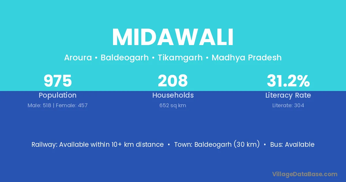 Baldeogarh (30 km) is the nearest town to Midawali village for major economic activities and is located approximately 30 km away.
