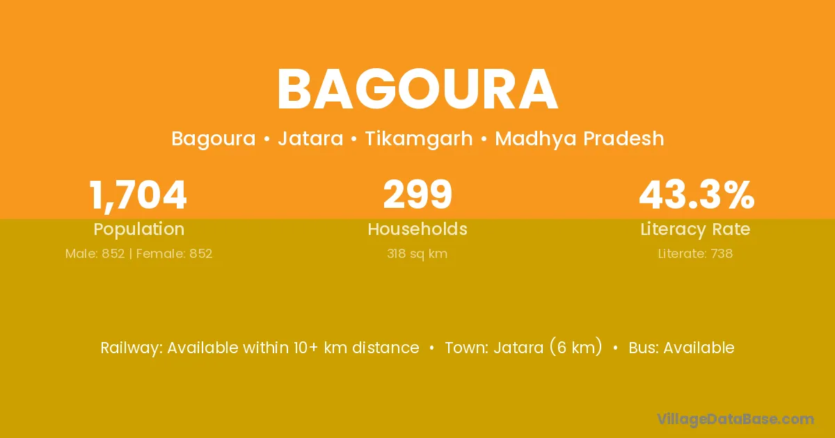 Bagoura village has a total population of 1,704 people, of which 852 are males and 852 are females.