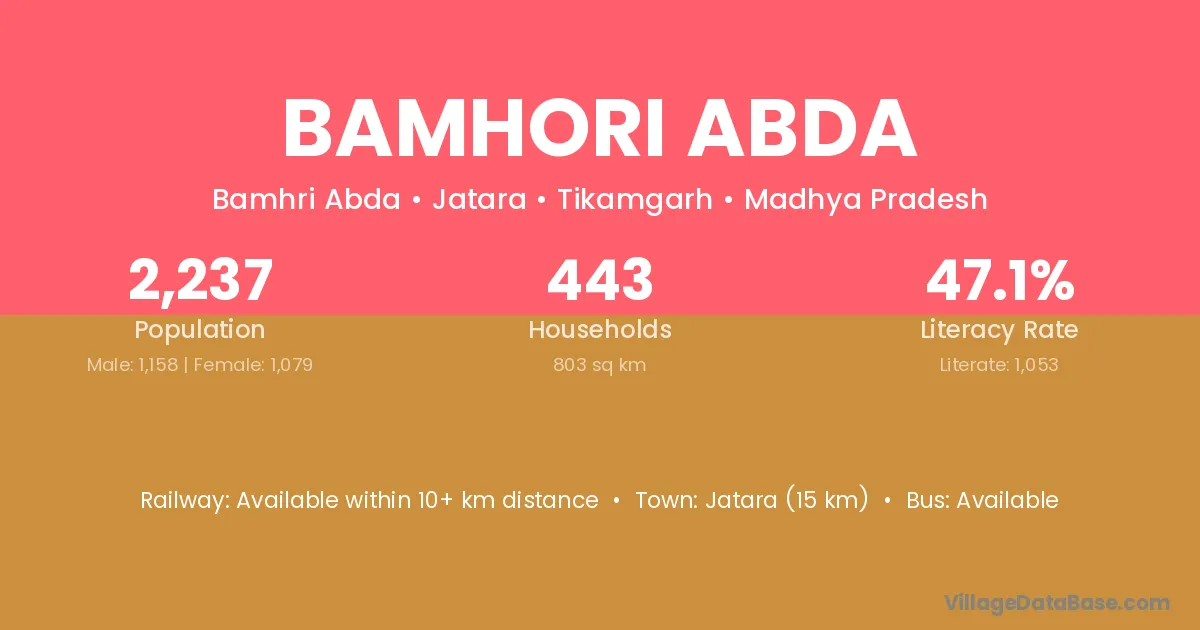Bamhori Abda village has a total population of 2,237 people, of which 1,158 are males and 1,079 are females.