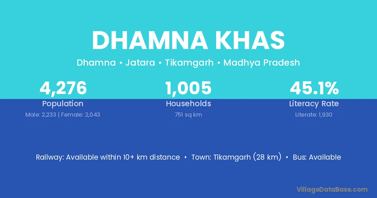 Tikamgarh (28 km) is the nearest town to Dhamna Khas village for major economic activities and is located approximately 28 km away.