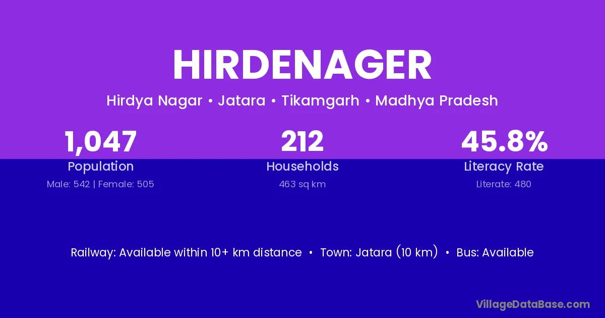 Jatara (10 km) is the nearest town to Hirdenager village for major economic activities and is located approximately 10 km away.