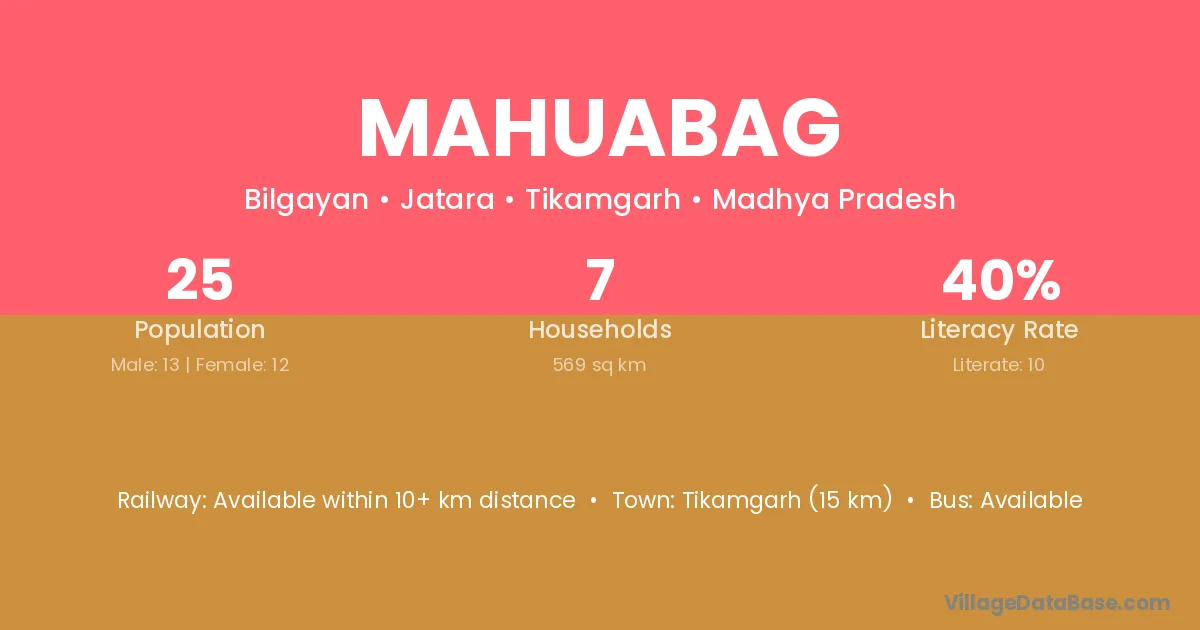 Tikamgarh (15 km) is the nearest town to Mahuabag village for major economic activities and is located approximately 15 km away.
