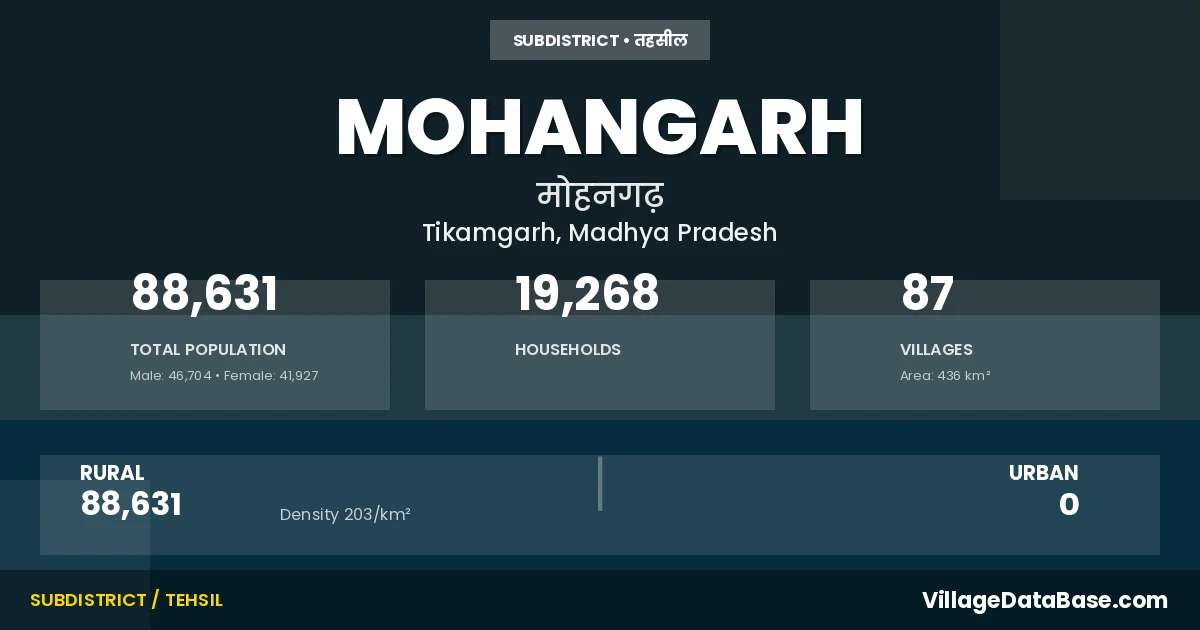 Mohangarh is a town and Tehsil in the Tikamgarh district of the Madhya Pradesh. In India, a Tehsil is a subdivision of a district responsible for the administration and revenue collection of a specific area within the district. Tehsils play a crucial role in the local governance structure, contributing significantly to the development and administration of their communities.