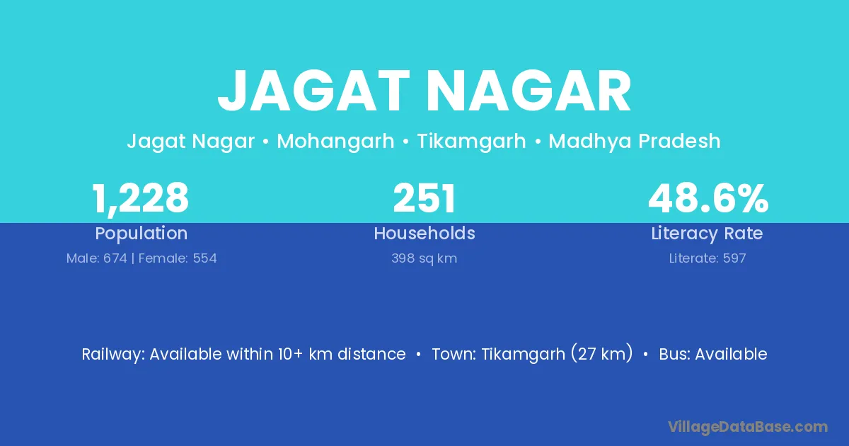 Tikamgarh (27 km) is the nearest town to Jagat Nagar village for major economic activities and is located approximately 27 km away.