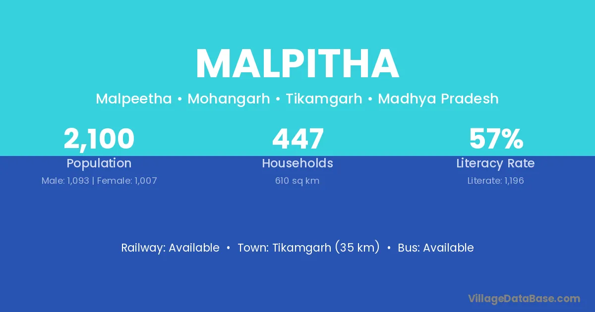 Tikamgarh (35 km) is the nearest town to Malpitha village for major economic activities and is located approximately 35 km away.