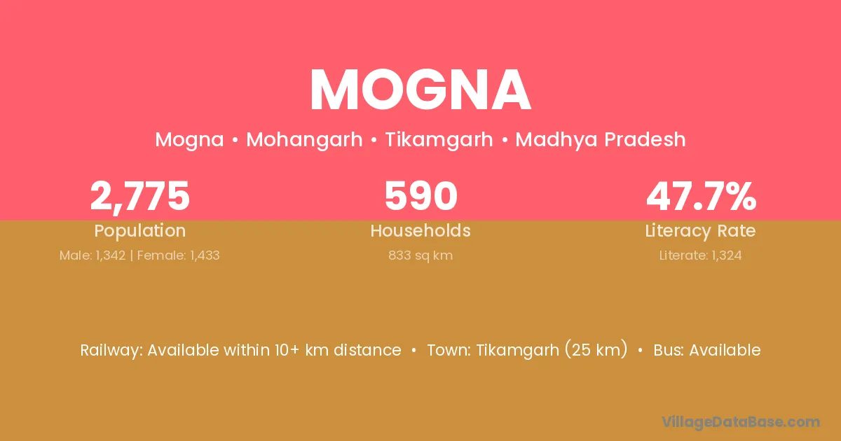 Tikamgarh (25 km) is the nearest town to Mogna village for major economic activities and is located approximately 25 km away.