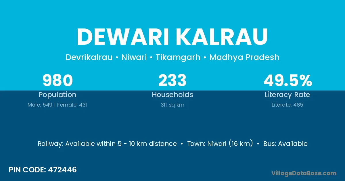 Niwari (16 km) is the nearest town to Dewari Kalrau village for major economic activities and is located approximately 16 km away.