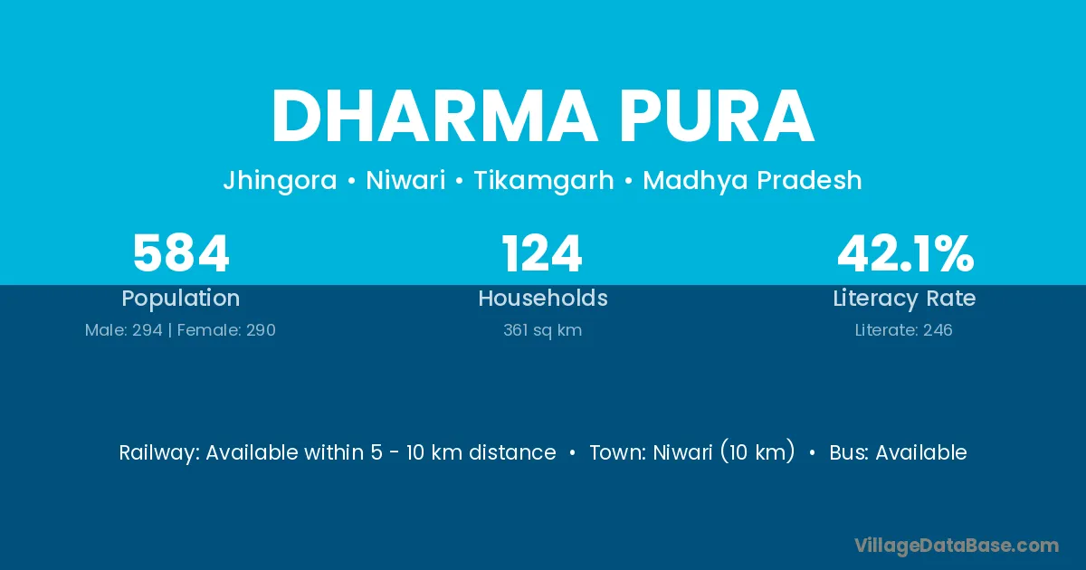 Dharma Pura village has a total population of 584 people, of which 294 are males and 290 are females.