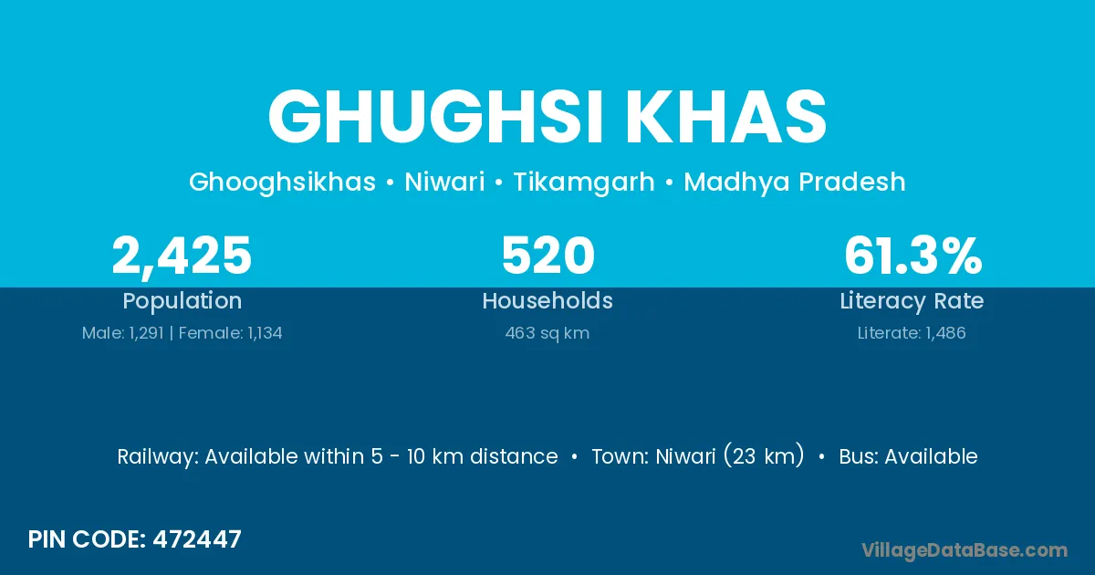 Niwari (23 km) is the nearest town to Ghughsi Khas village for major economic activities and is located approximately 23 km away.
