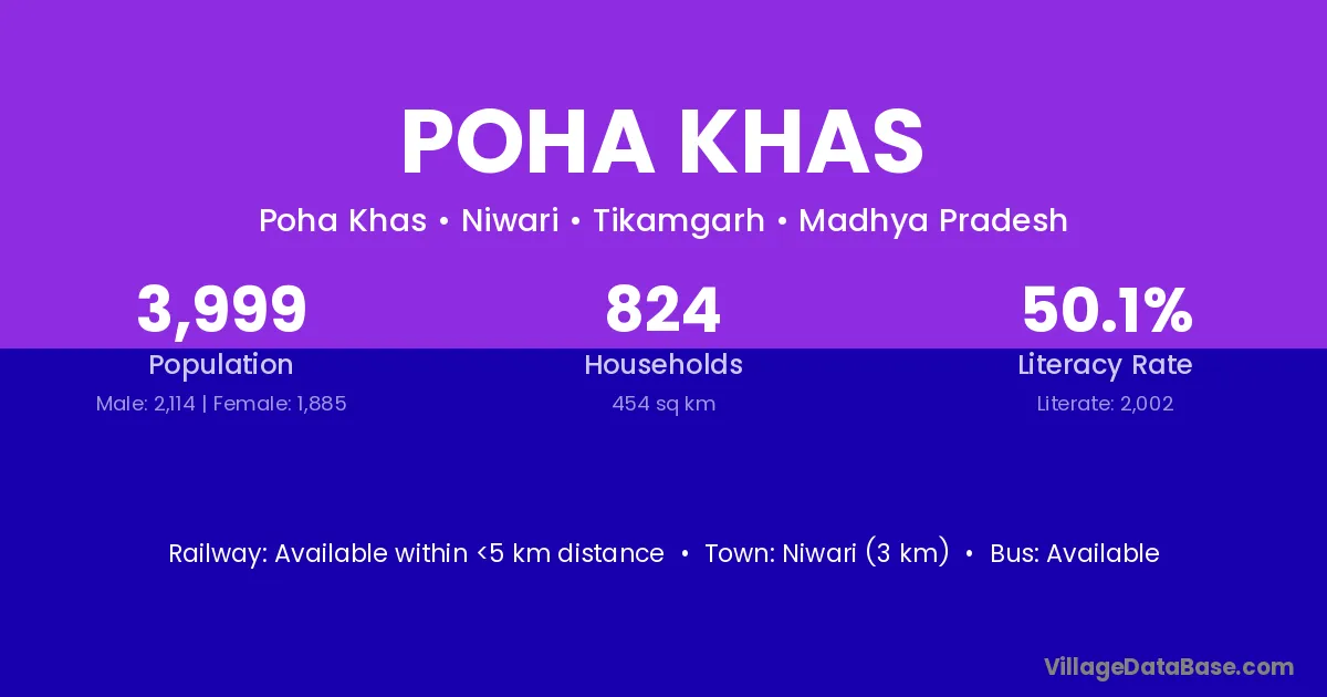 Niwari (3 km) is the nearest town to Poha Khas village for major economic activities and is located approximately 3 km away.