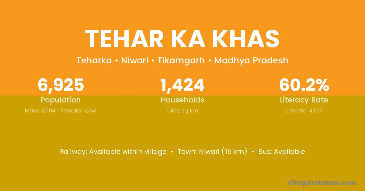 Niwari (15 km) is the nearest town to Tehar Ka Khas village for major economic activities and is located approximately 15 km away.