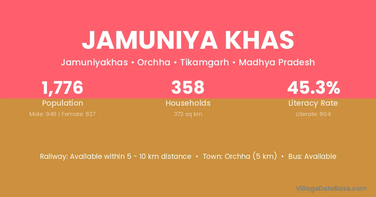 Orchha (5 km) is the nearest town to Jamuniya Khas village for major economic activities and is located approximately 5 km away.