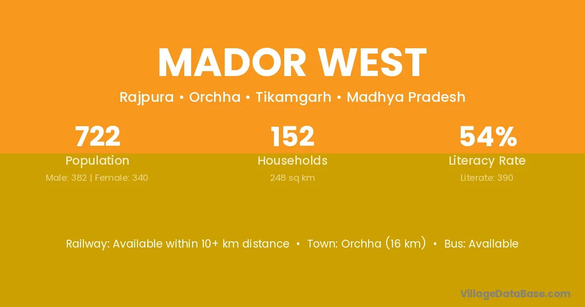 Orchha (16 km) is the nearest town to Mador West village for major economic activities and is located approximately 16 km away.