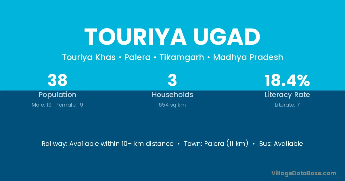 Touriya Ugad village has a total population of 38 people, of which 19 are males and 19 are females.