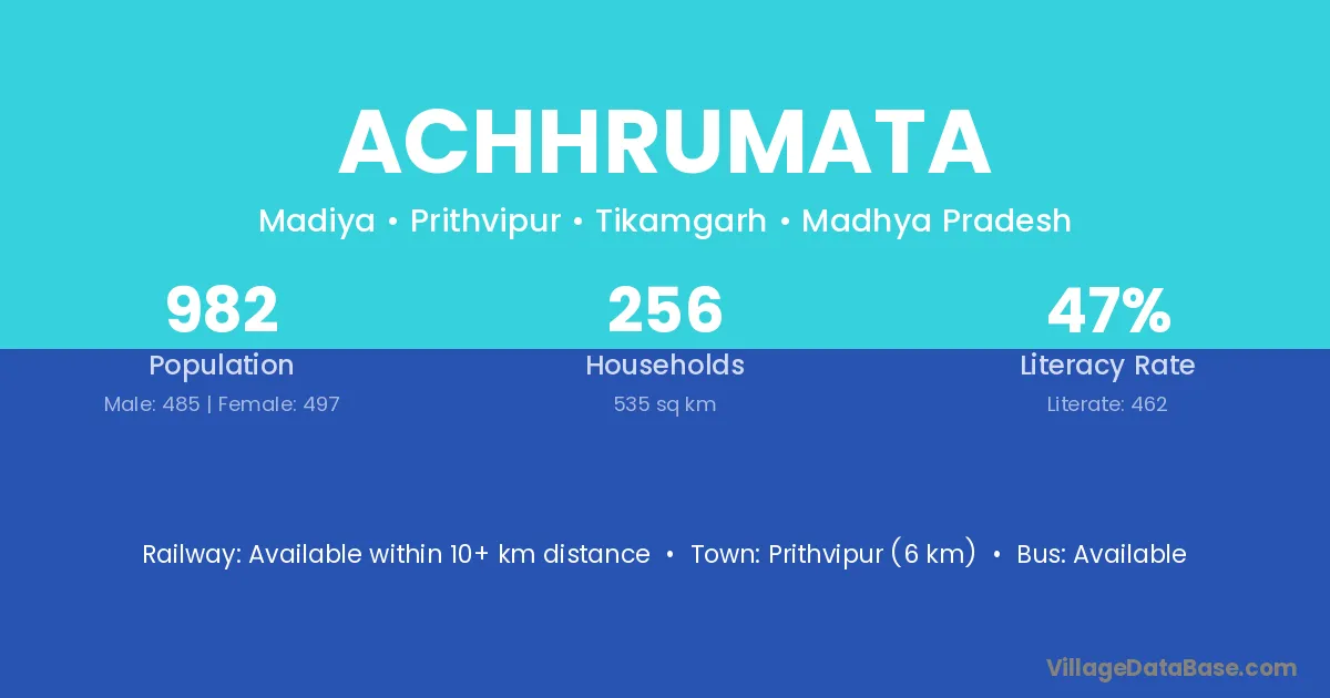 Achhrumata village has a total population of 982 people, of which 485 are males and 497 are females.