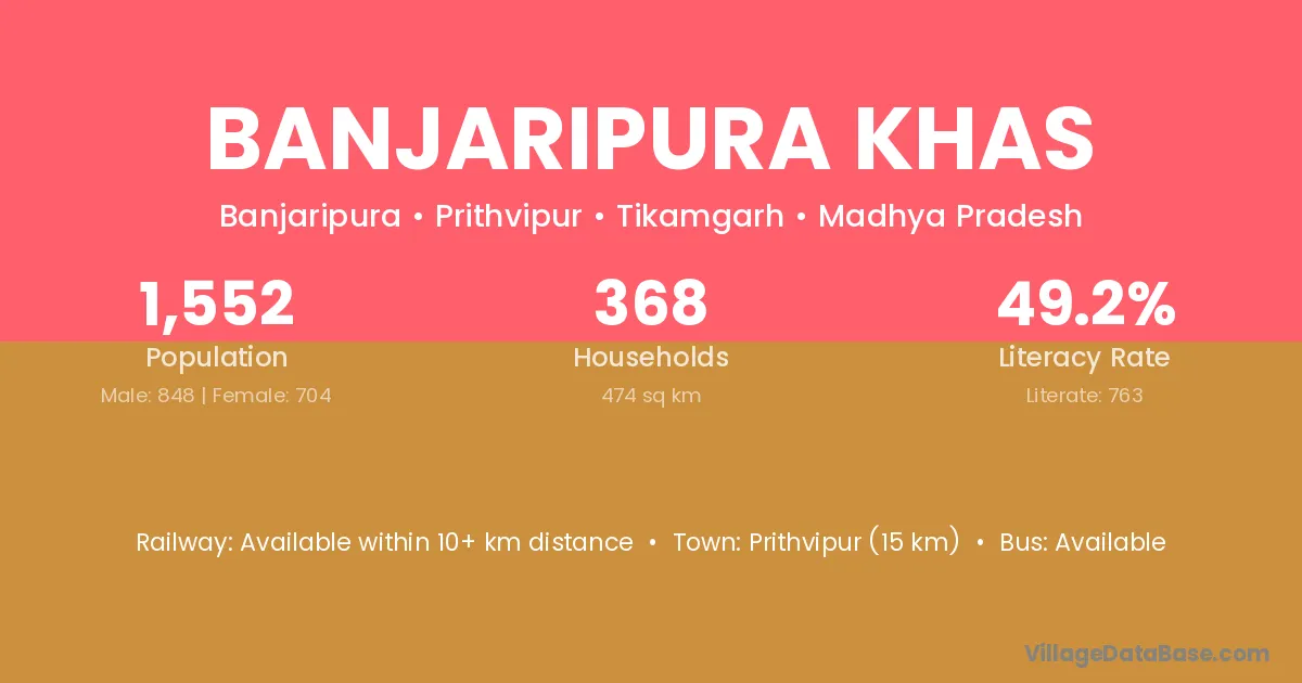 Prithvipur (15 km) is the nearest town to Banjaripura Khas village for major economic activities and is located approximately 15 km away.