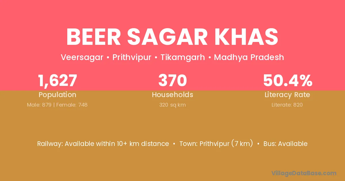 Beer Sagar Khas village has a total population of 1,627 people, of which 879 are males and 748 are females.