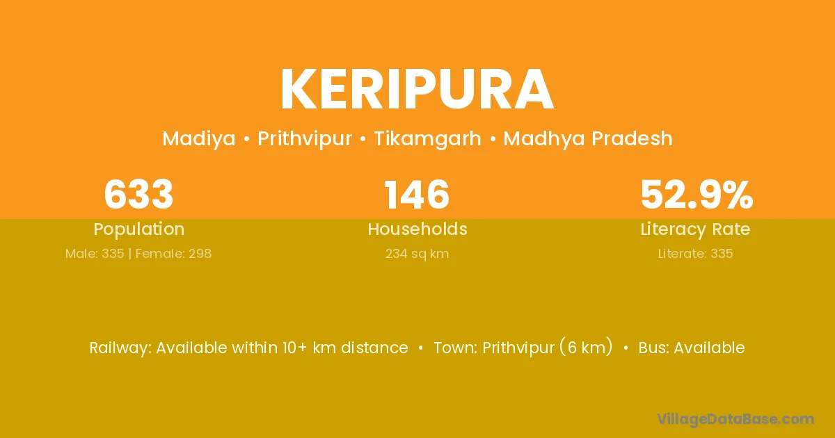 Prithvipur (6 km) is the nearest town to Keripura village for major economic activities and is located approximately 6 km away.