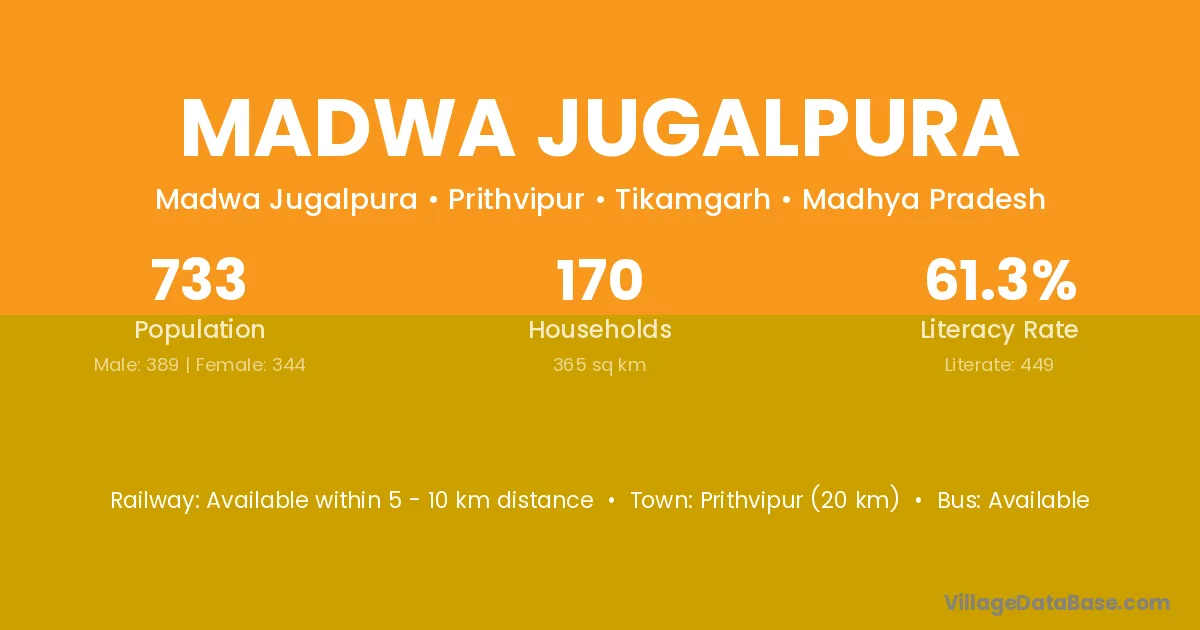 Madwa Jugalpura village has a total population of 733 people, of which 389 are males and 344 are females.