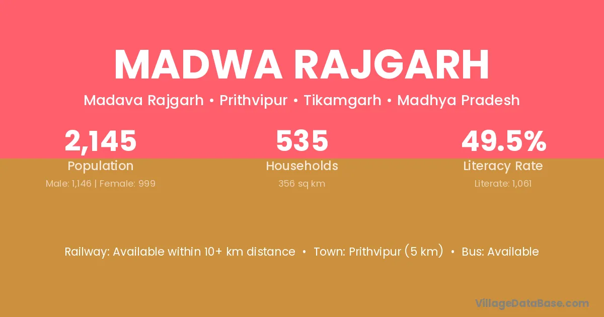 Prithvipur (5 km) is the nearest town to Madwa Rajgarh village for major economic activities and is located approximately 5 km away.