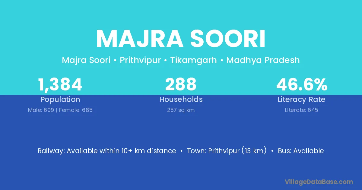 Prithvipur (13 km) is the nearest town to Majra Soori village for major economic activities and is located approximately 13 km away.