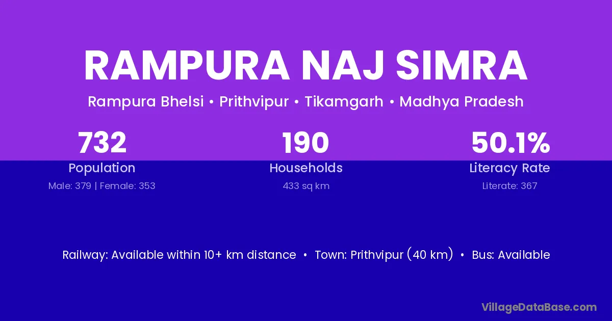 Prithvipur (40 km) is the nearest town to Rampura Naj Simra village for major economic activities and is located approximately 40 km away.