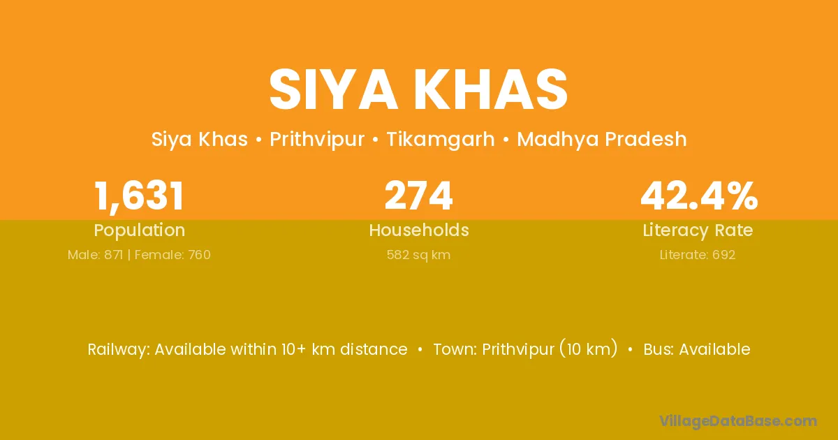Prithvipur (10 km) is the nearest town to Siya Khas village for major economic activities and is located approximately 10 km away.