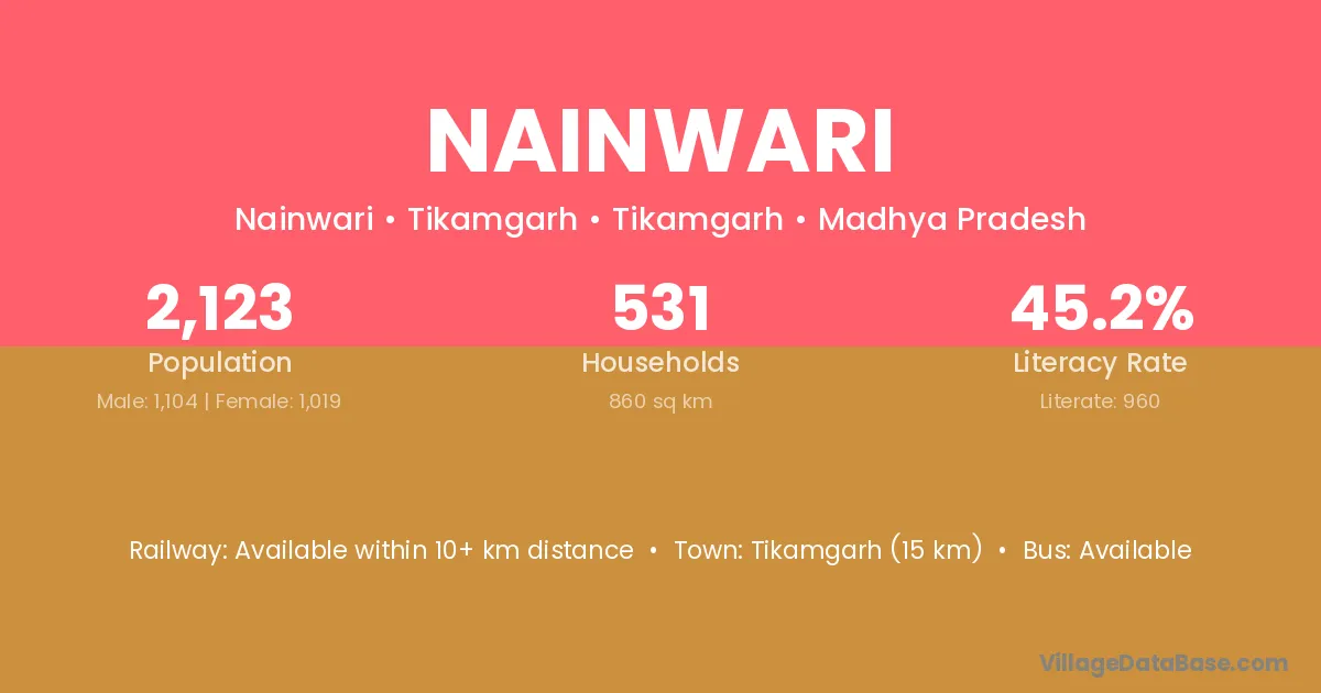 Tikamgarh (15 km) is the nearest town to Nainwari village for major economic activities and is located approximately 15 km away.