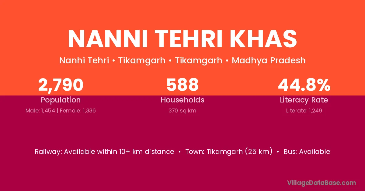 Tikamgarh (25 km) is the nearest town to Nanni Tehri Khas village for major economic activities and is located approximately 25 km away.