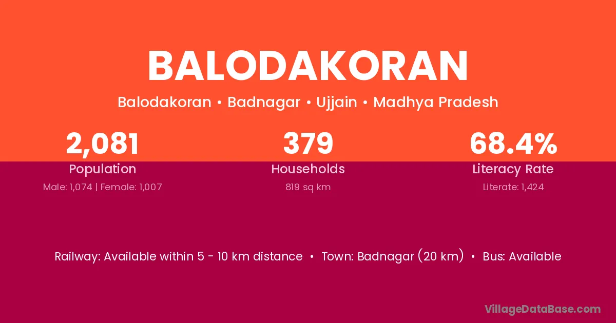 Badnagar (20 km) is the nearest town to Balodakoran village for major economic activities and is located approximately 20 km away.
