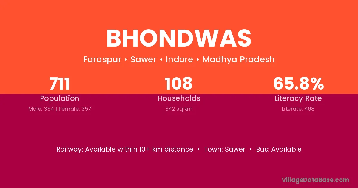 Ujjain (23 km) is the nearest town to Bhondwas village for major economic activities and is located approximately 23 km away.