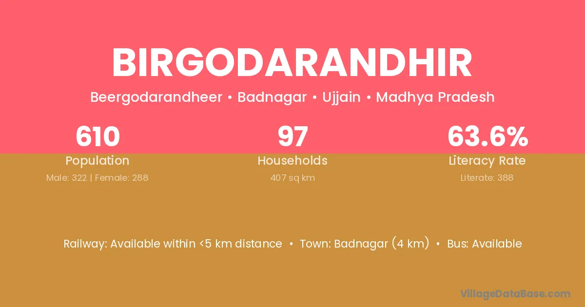 Badnagar (4 km) is the nearest town to Birgodarandhir village for major economic activities and is located approximately 4 km away.