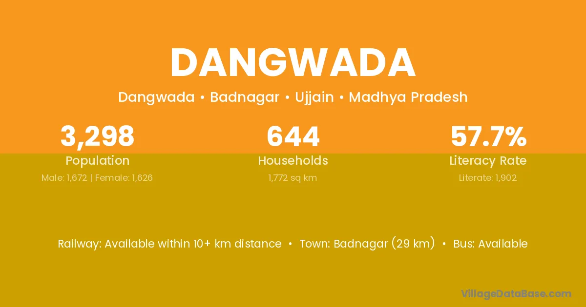Dangwada village has a total population of 3,298 people, of which 1,672 are males and 1,626 are females.