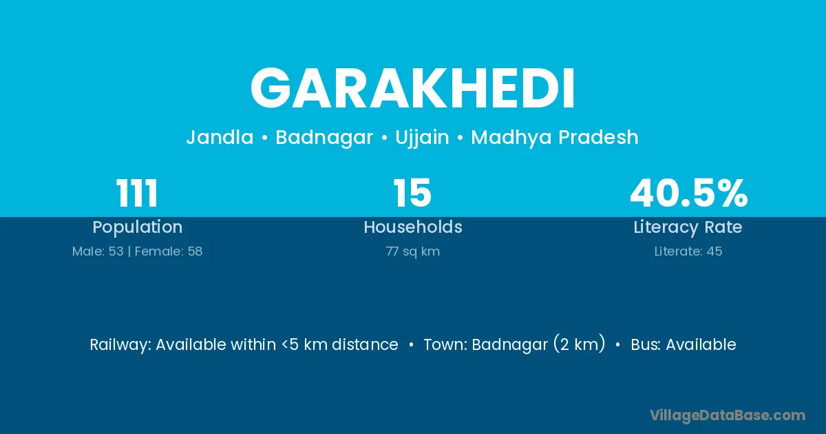 Garakhedi village has a total population of 111 people, of which 53 are males and 58 are females.